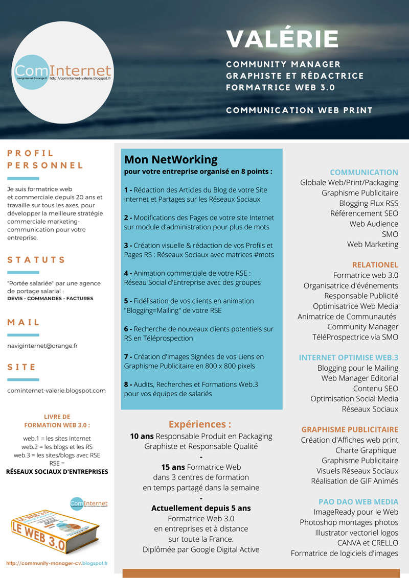 Bonjour ! Je vous forme pour optimiser vos pages et profils Réseaux Sociaux et animer le Blog de votre site Internet ! Formations en ligne par Skype "partages écrans" : CANVA, CRELLO, Lumen5, Facebook, Linkedin, Instagram, Behance, Pinterest, Twitter,...et tous les 37 autres Réseaux Sociaux généralistes et dédiés métiers !